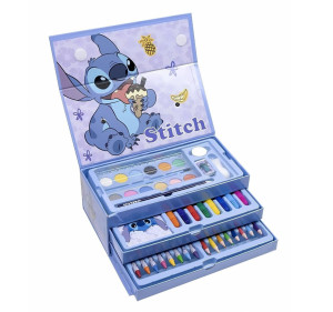 Kreslící souprava Stitch v praktickém kufříku. Obsahuje: celkem 42 ks dle vyobrazení - fixky, crayony, barvičky, notýsek, pastelky, tužku, gumu, ořezávátko, štětec, houbičku a jiné. Rozměry balení: 26 x 14 x 9 cm. Oficiální licence, Cerda.