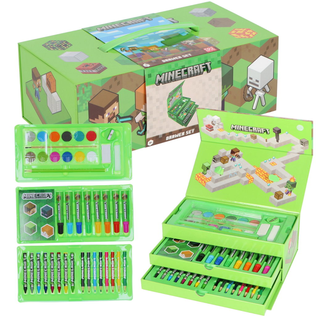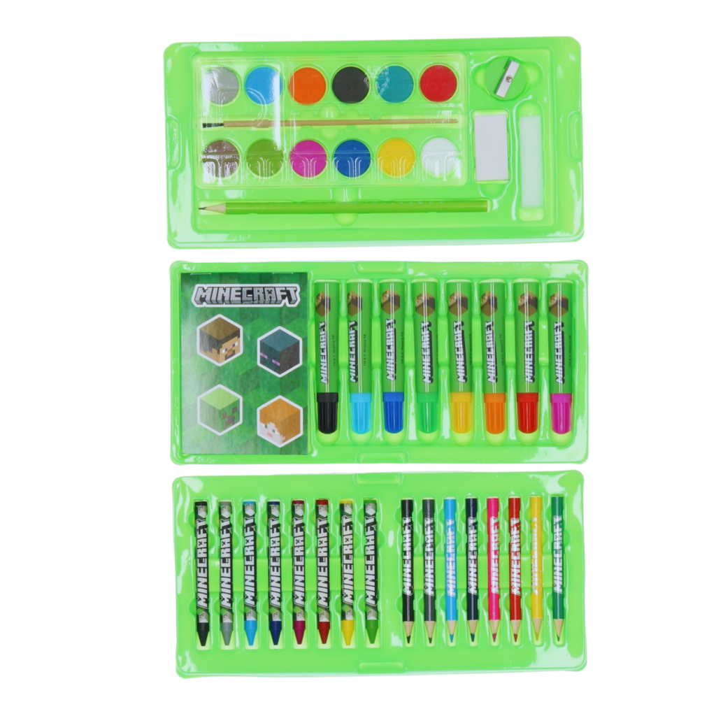 Kreslící souprava Minecraft v praktickém kufříku. Obsahuje: celkem 52 ks dle vyobrazení: fixky, crayony, barvičky, notýsek, pastelky, tužku, gumu, ořezávátko, štětec, houbičku a jiné. Rozměry balení: 26 x 13,5 x 9,5 cm. Oficiální licence, Mister Licence. Výrobce: Mister Licence. Mister Licence company Poligono 43 03330, Spain info@misterlicence.com