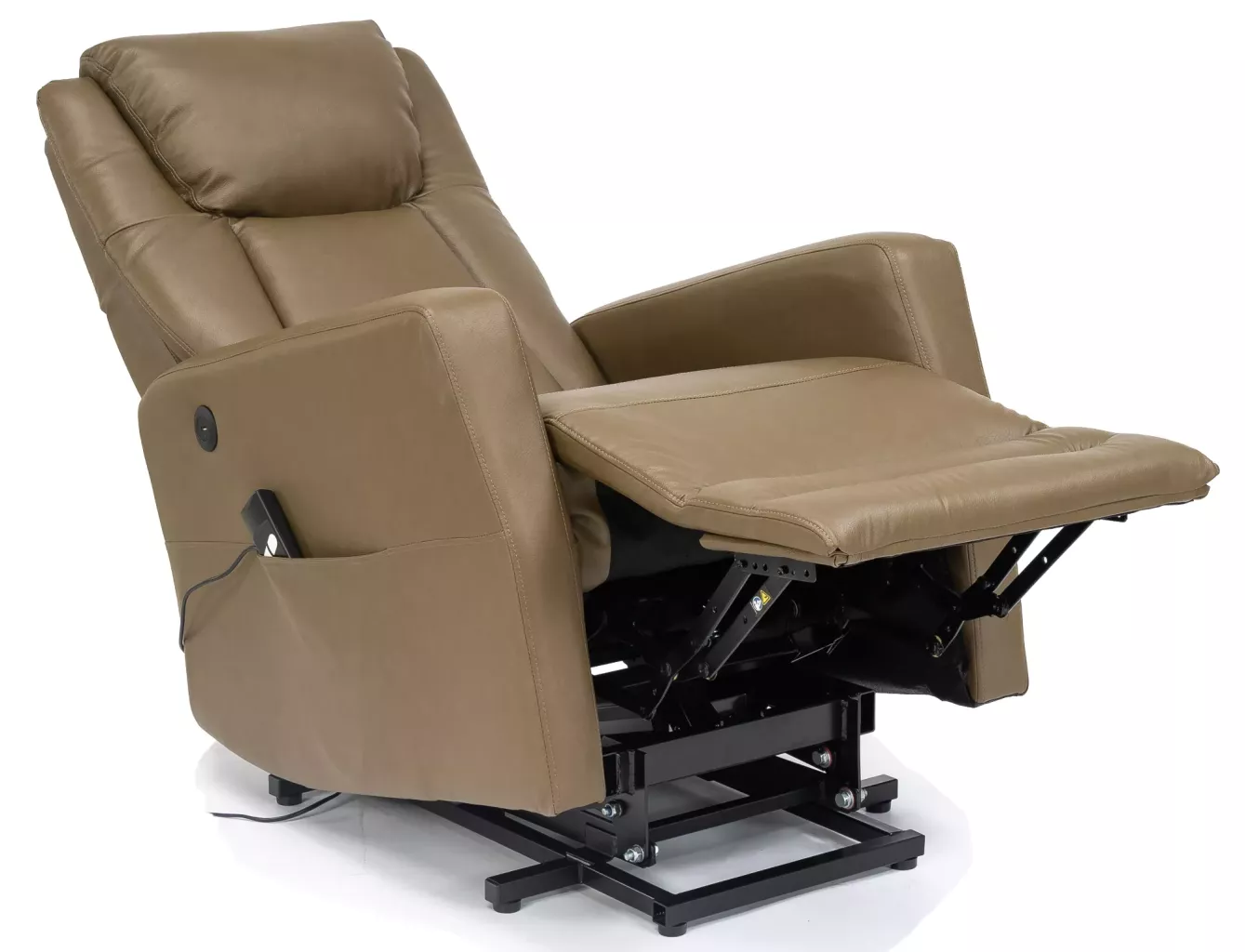 Dotaz na produkt Na splátky ještě dnesElektricky polohovací vzpřímená židle, nastavitelná opěrka hlavy, syntetická kůže Buffalo, barva: olivová 10. Dálkové ovládání s kabelem pro ovládání sklonu židle, kapsa a USB nabíjecí zásuvka na pravé straně.