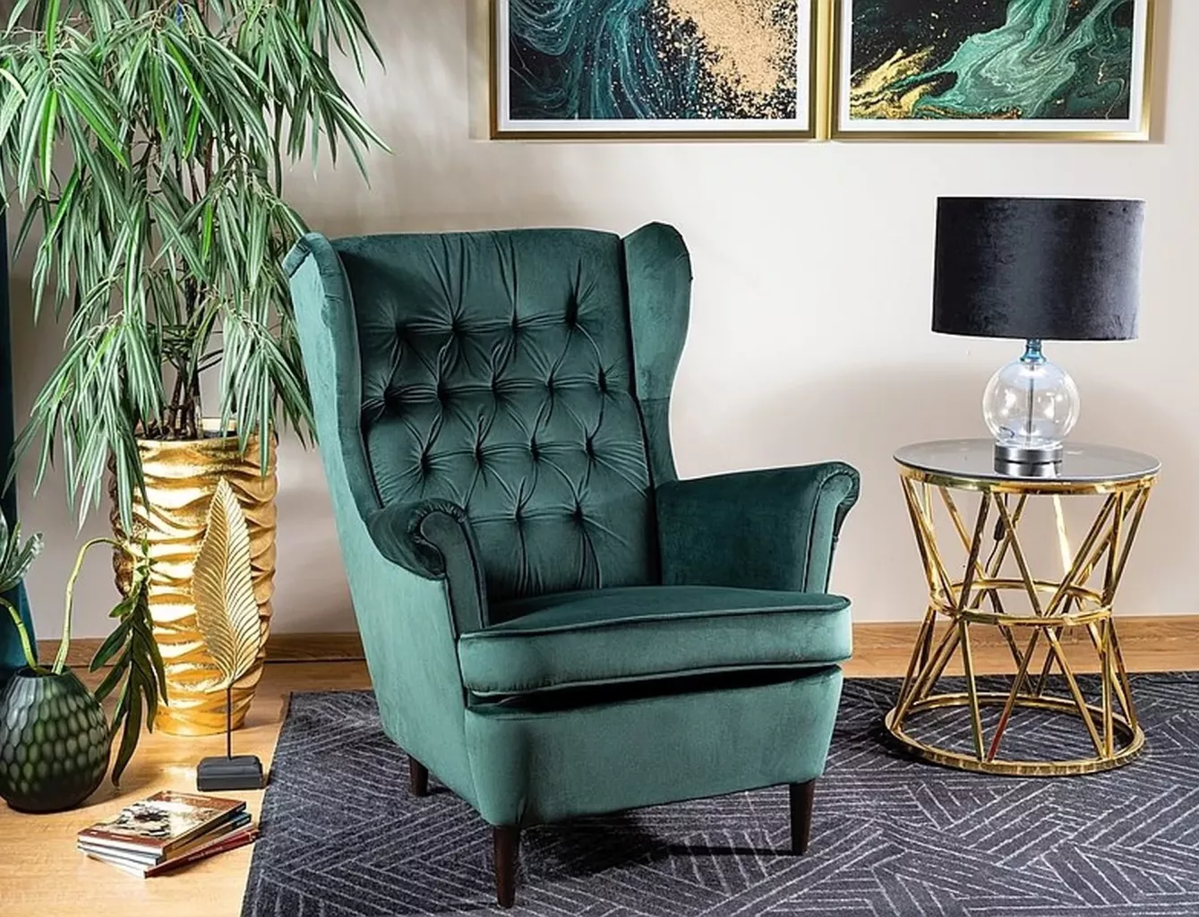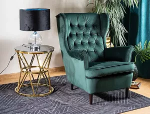 Křeslo, sametová látka: zelená BLUVEL 78 / dřevo: barva wenge