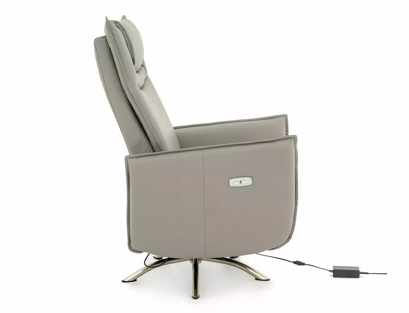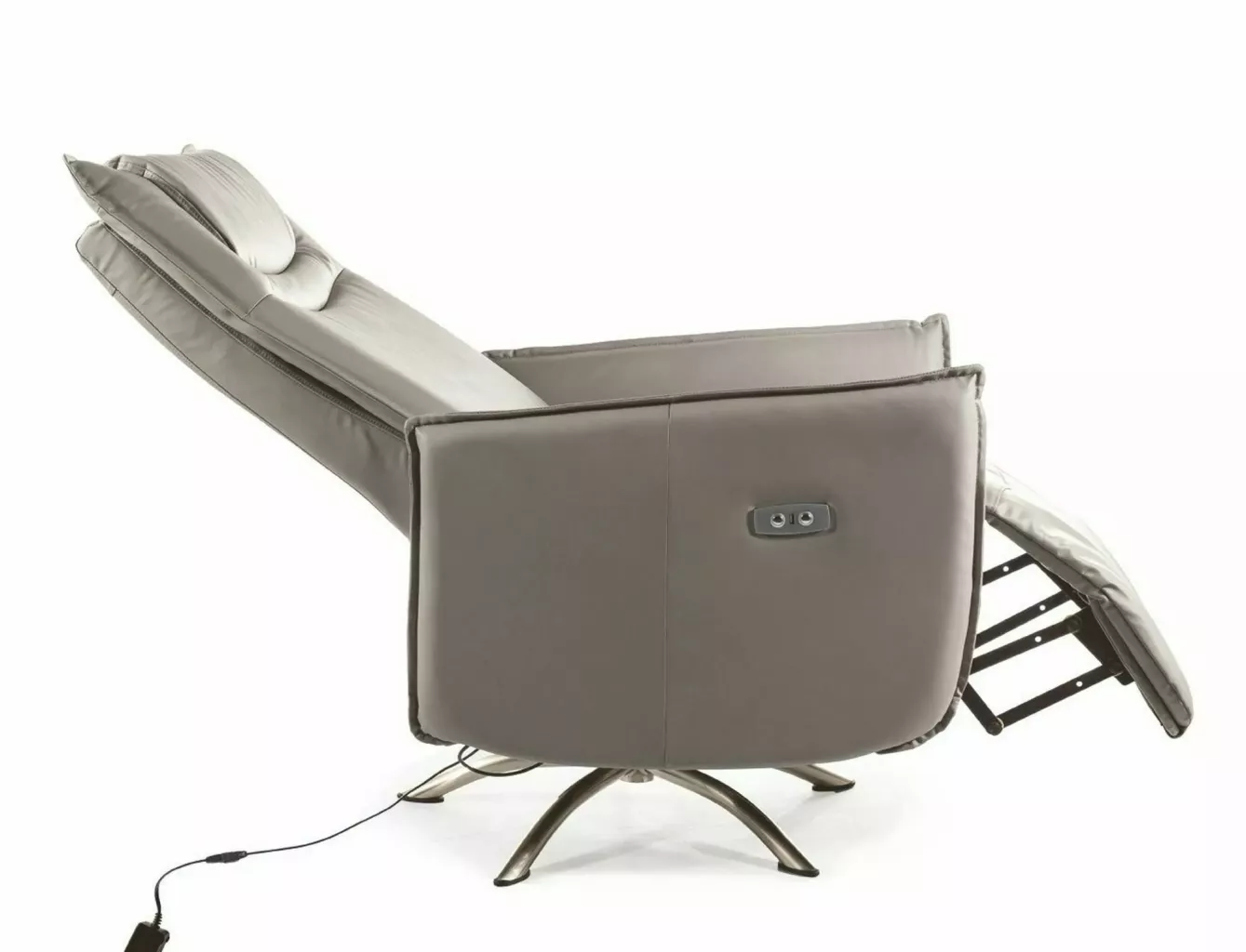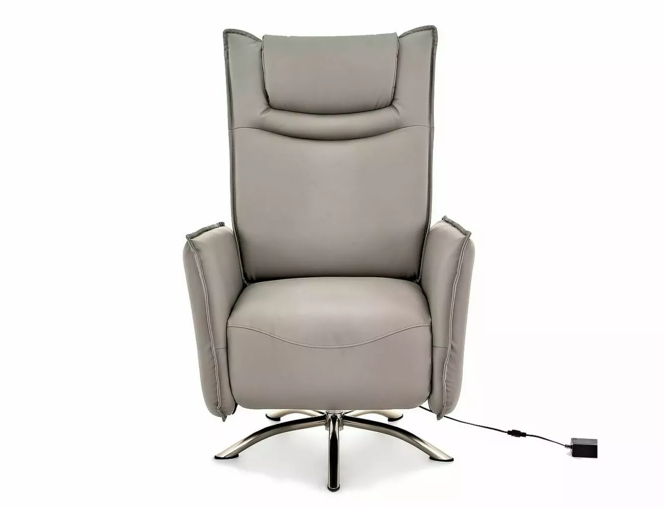 Dotaz na produkt Na splátky ještě dnesElektricky polohovací křeslo, syntetická kůže, barva: šedá, čalounění 217. Podnož je vyrobena z kartáčované oceli a umožňuje otáčení křesla o 360 stupňů, ovládací panel je vybaven USB portem.