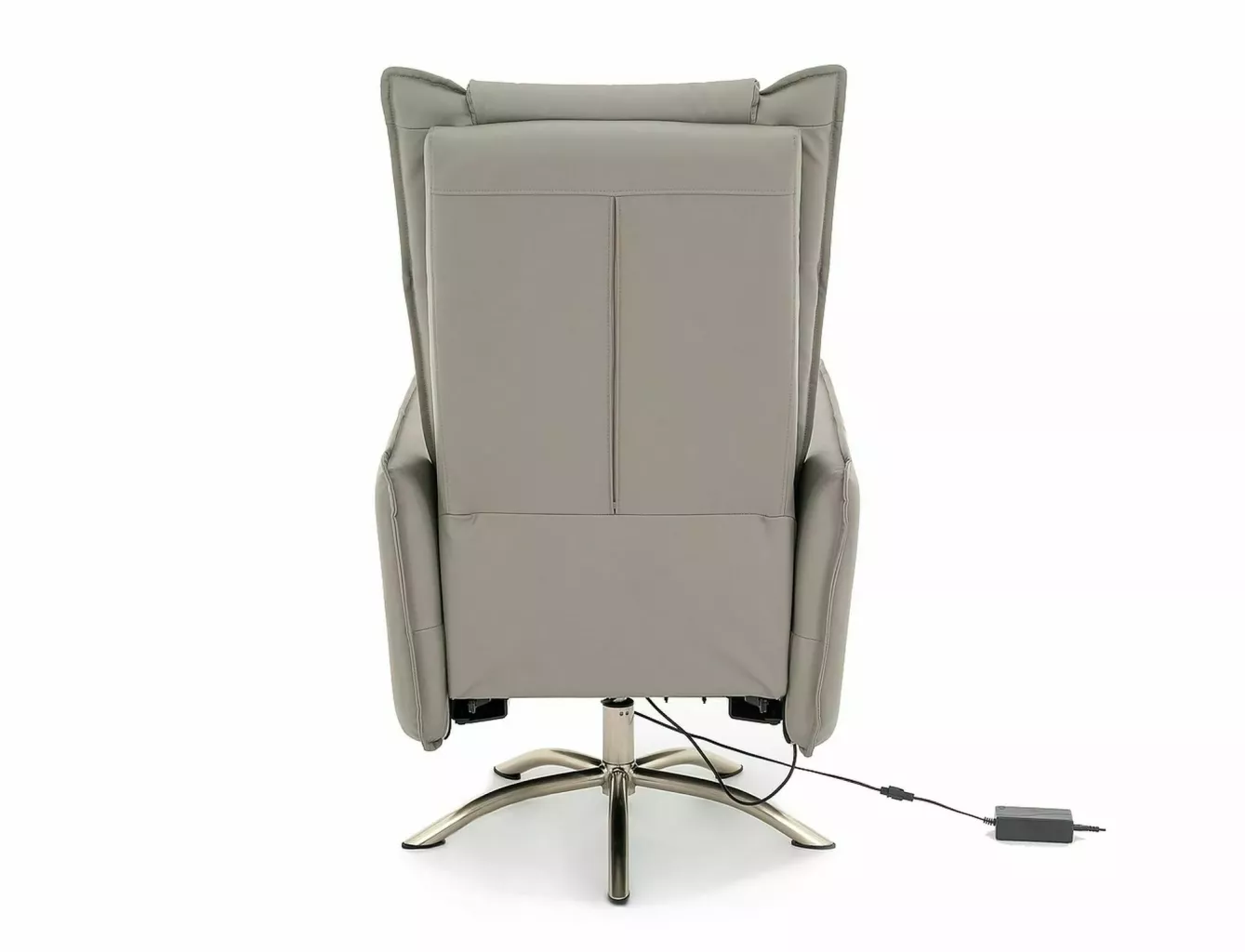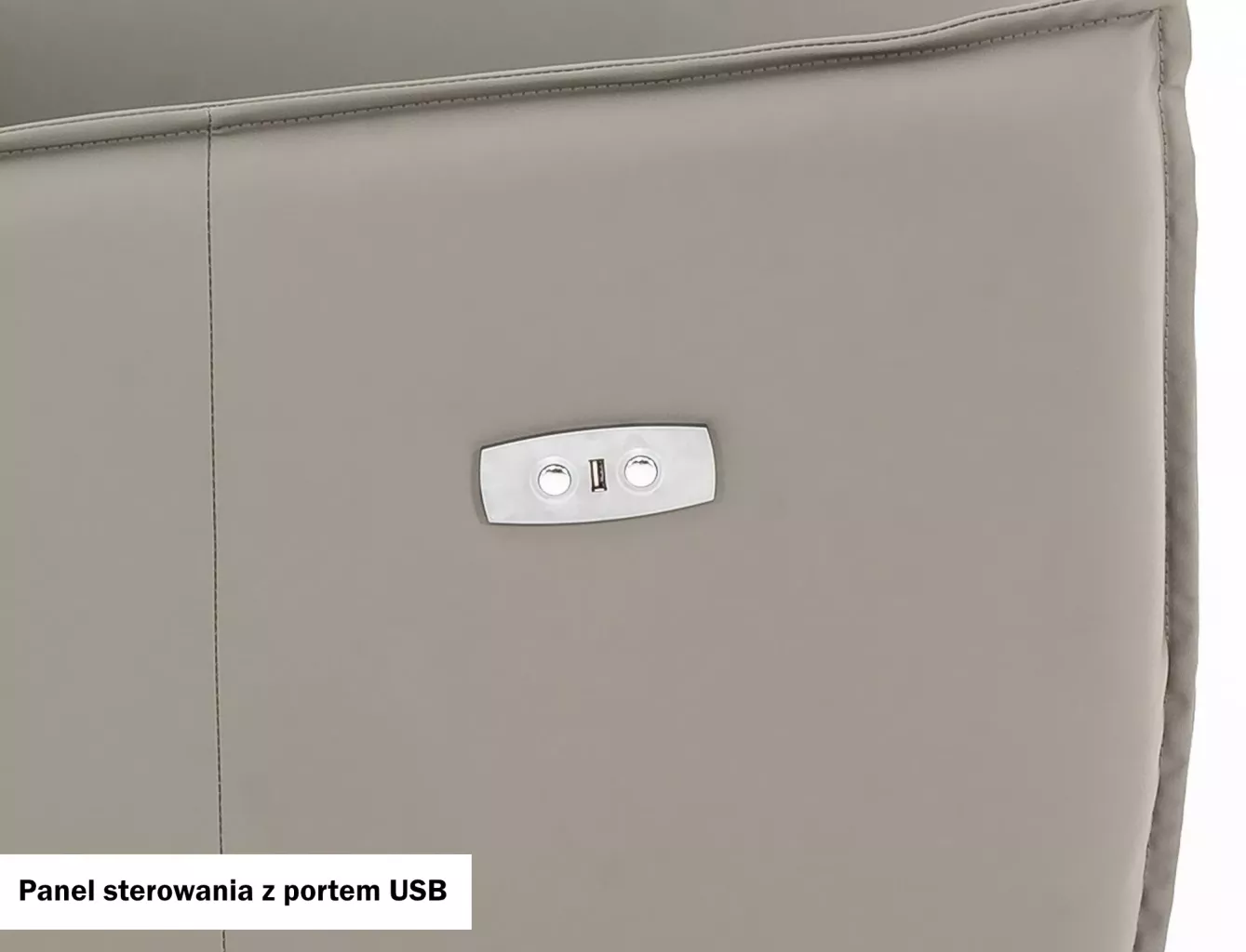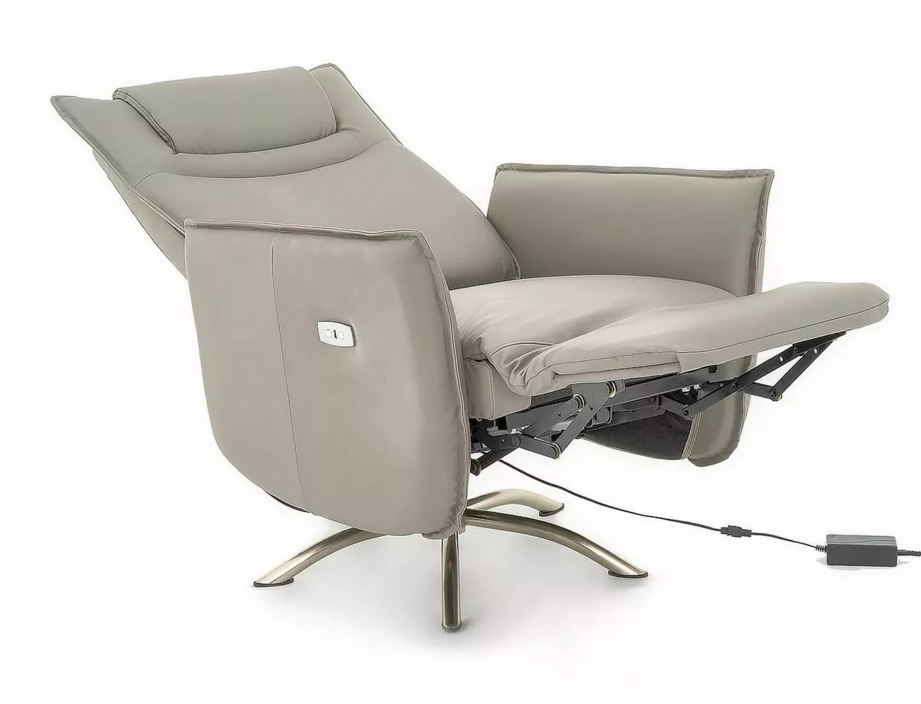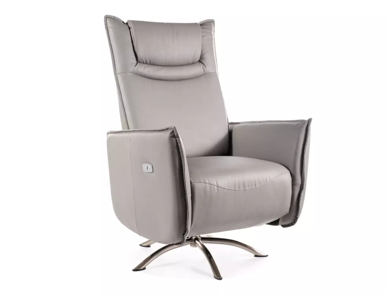 Dotaz na produkt Na splátky ještě dnesElektricky polohovací křeslo, syntetická kůže, barva: šedá, čalounění 217. Podnož je vyrobena z kartáčované oceli a umožňuje otáčení křesla o 360 stupňů, ovládací panel je vybaven USB portem.