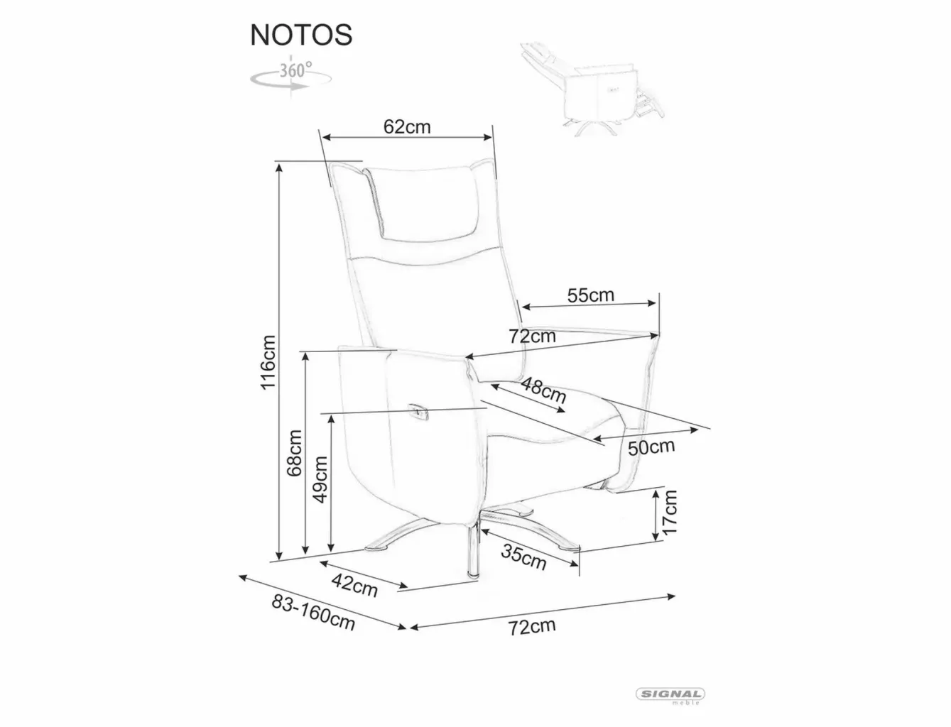 Rozměry křesla: A - 116, B - 72, C - 49, D - 48, E - 83÷160, F - 17 cm