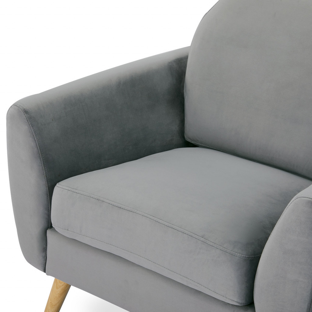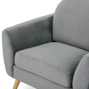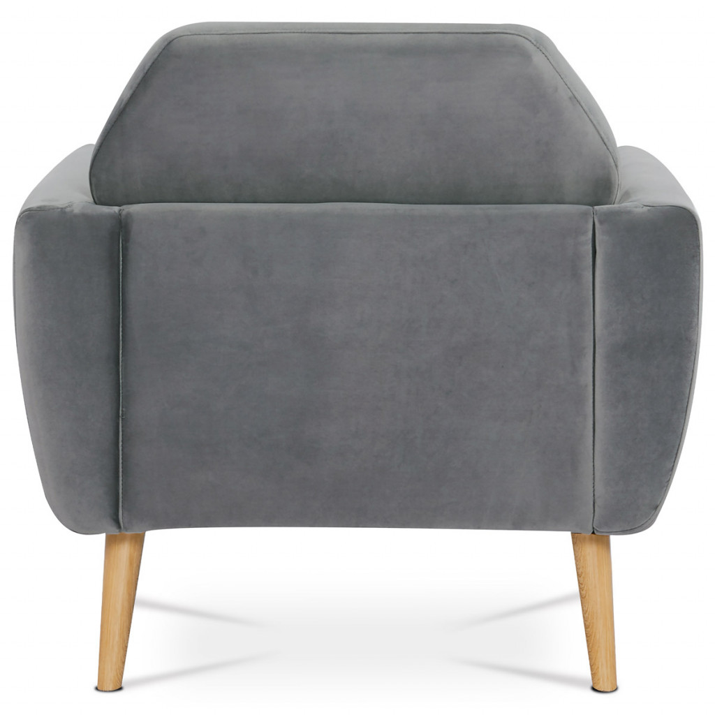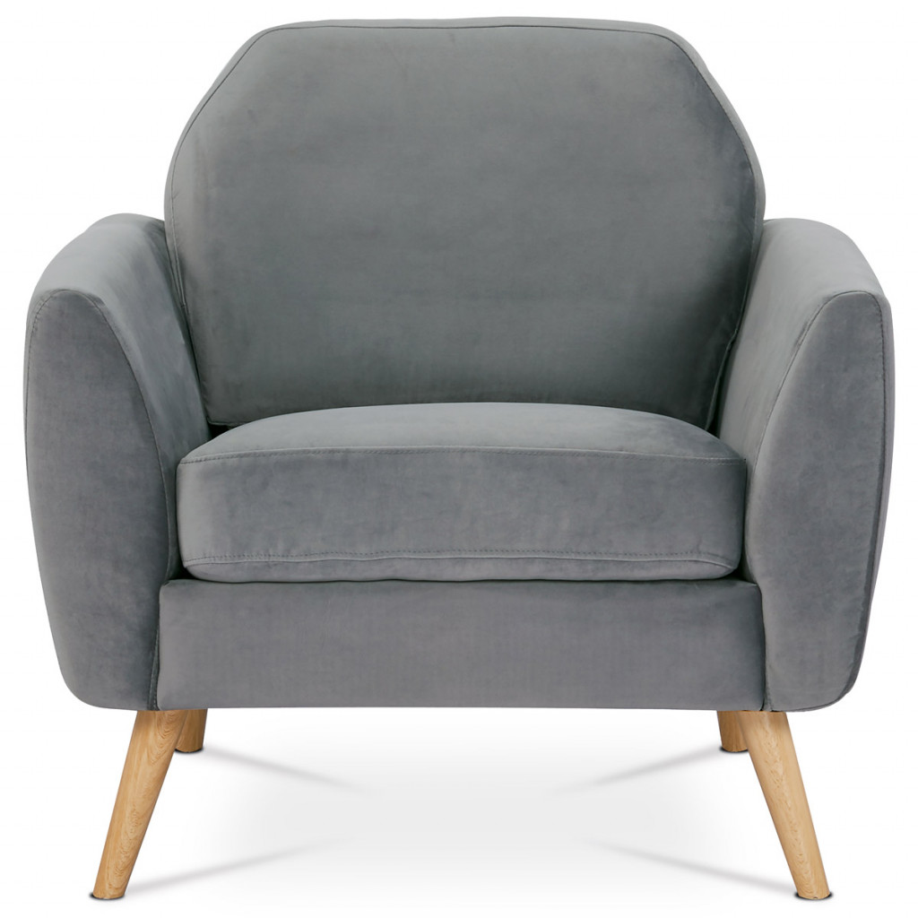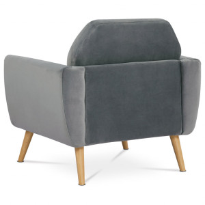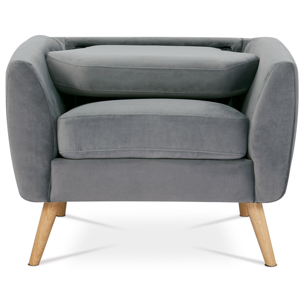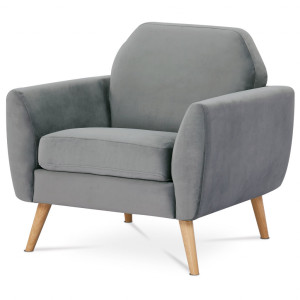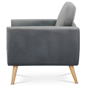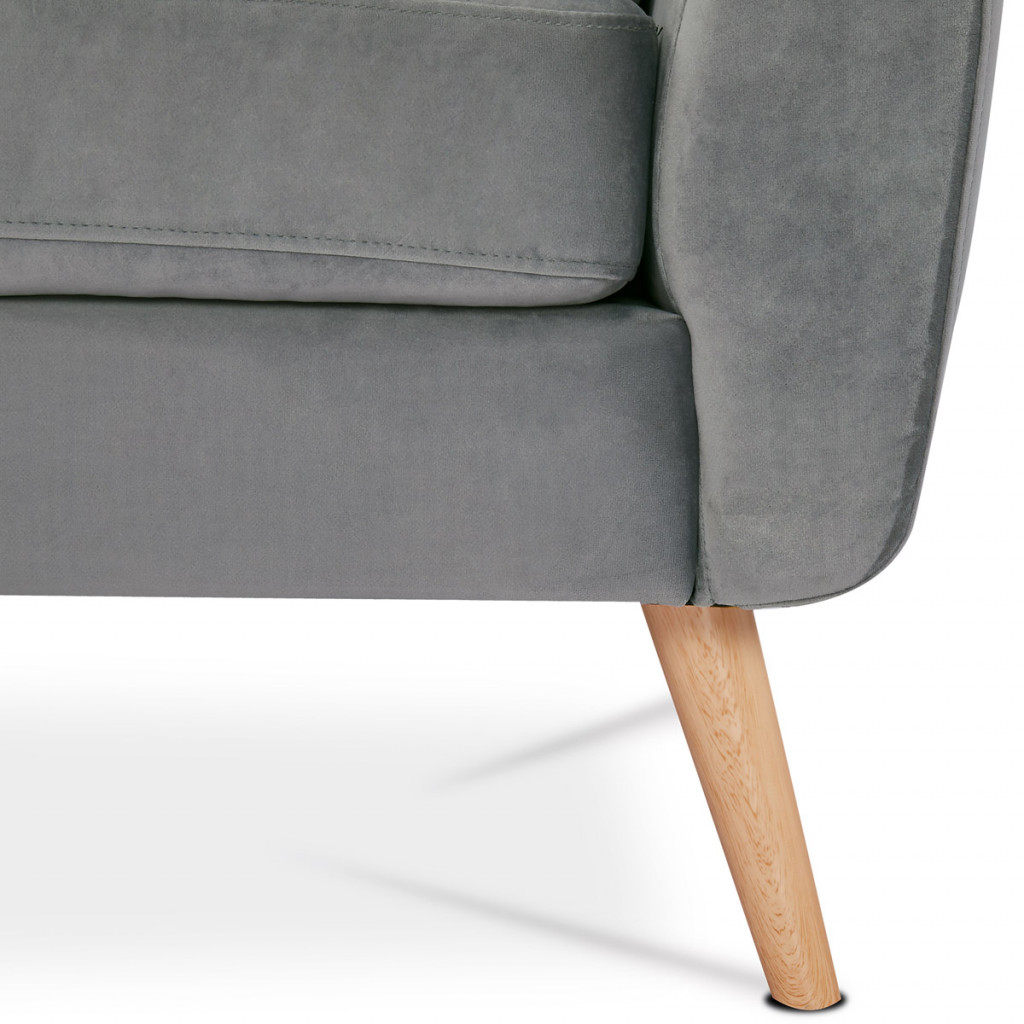 Potah je ze sametové matné látky v trendy šedostříbrném odstínu, kostra z masivního borovicového dřeva a překližky. Výplň je z kvalitní PU pěny, která je zpevněna ocelovými vlnovci a textilními popruhy. Kónické nohy jsou netradičně vyrobené z velmi houževnatého a pevného plastu v povrchovém dekoru přírodního buku. Riziko poškození podlahových krytin je zde eliminováno plastovými kluzáky na dotykové ploše nohou.