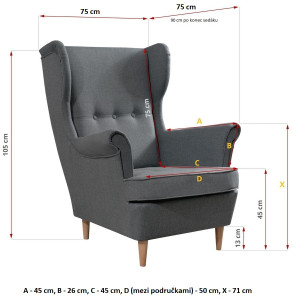 Dotaz na produkt Na splátky ještě dnesCeločalouněné pohodlné křeslo v netradičním a velmi trendy vzhledu. Pohodlné sezení zaručují vlnovcové pružiny spolu s PUR pěnou (T30). Nožky jsou dřevěné - buk, vysoké 13 cm. Výška sedu je 45 cm. Výška opěradla je 75 cm. Barevné provedení - látka Hugo 94.
