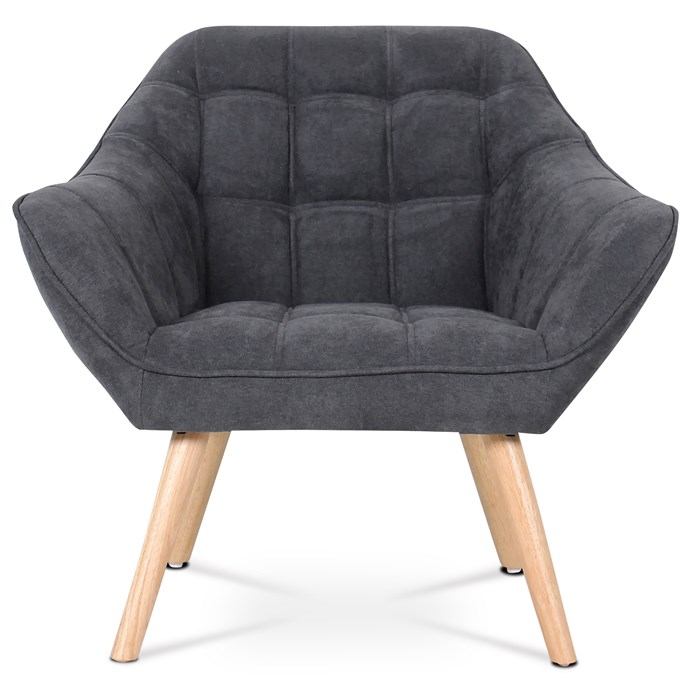 Křeslo s tmavě šedým látkovým potahem nabízí pohodlné sezení díky měkkému polstrování a designovému prošití, které dodává celku výrazný charakter. Masivní nohy z kaučukovníku zajišťují stabilitu a dlouhou životnost, přičemž jejich přírodní odstín kontrastuje s tmavým odstínem čalounění. Široké opěradlo a područky jsou ergonomicky tvarované pro maximální komfort během odpočinku. Křeslo je vhodné do moderních i klasických interiérů, kde vynikne jako stylový a zároveň praktický doplněk. Jeho pevné provedení a kvalitní materiály zaručují spolehlivost při každodenním používání.