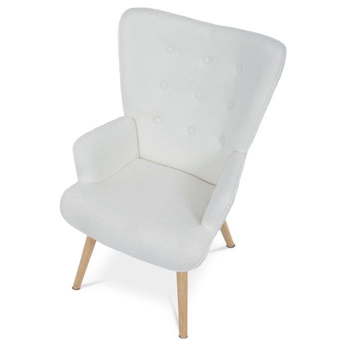 Zkrášlete svůj obývací pokoj nebo pracovnu tímto křeslem, které v sobě kombinuje bílou barvu a přírodní masivní nohy. Potah křesla je vyroben z látky bouclé s jemným povrchem. Pěnová výplň křesla Vám poskytne opravdový komfort.
