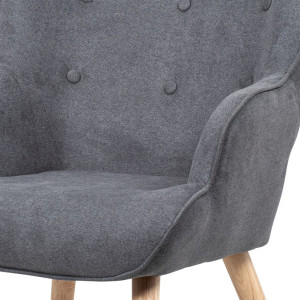 Křeslo ušák s podnožkou nabízí pohodlné posezení díky širokému sedáku a vysokému opěradlu s výraznými bočními křídly, která poskytují oporu a pocit soukromí. Potah je z příjemné šedé látky, která je příjemná na dotek a snadno se udržuje, zatímco masivní nohy z kaučukovníku zajišťují stabilitu a dlouhou životnost. Sedák i podnožka jsou vyplněny měkkou pěnou, která podporuje komfort při odpočinku. Design křesla kombinuje klasický tvar ušáku s moderním minimalistickým stylem, což umožňuje jeho využití v různých typech interiérů. Nosnost křesla odpovídá standardním parametrům pro domácí i kancelářské použití.