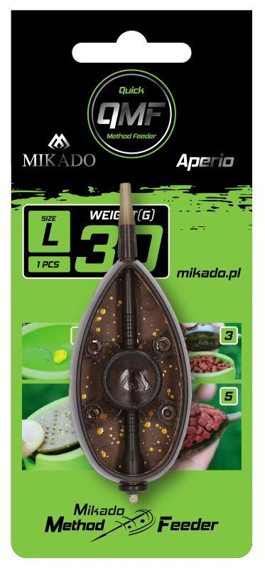 MIKADO Aperio Q.M.F. je evolucí klasického feederového krmítka – díky systému Quick Method Feeder (Q.M.F.) umožňuje výměnu krmítka během pár vteřin bez nutnosti rozebírat celou sestavu. Tato praktická sada obsahuje tři krmítka o hmotnosti 20 g a feederovou plnící formu.