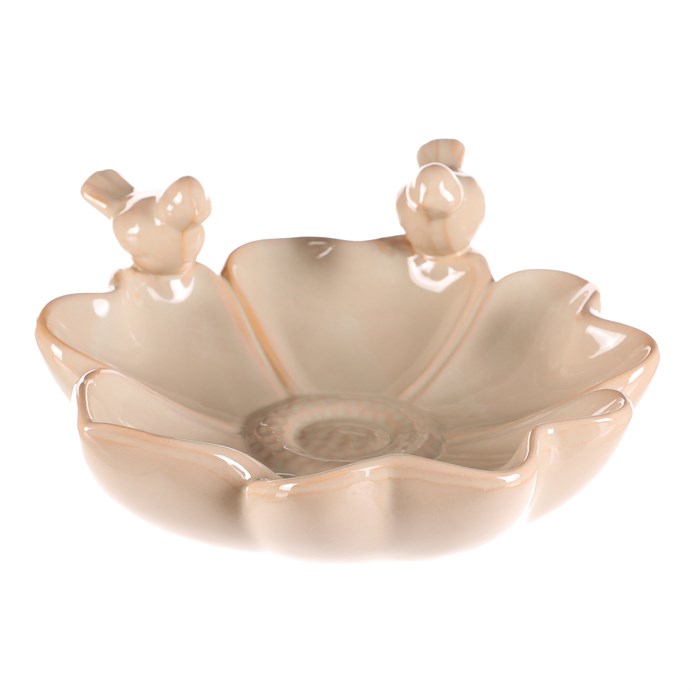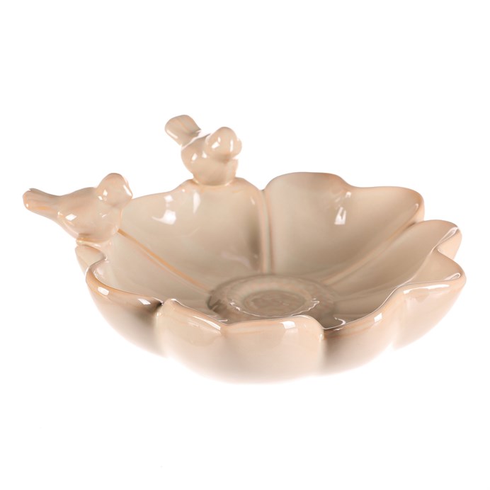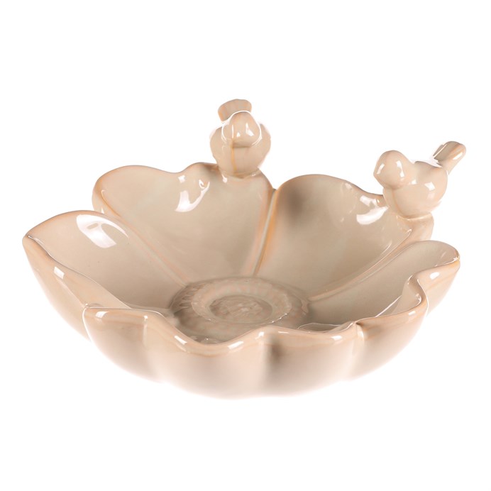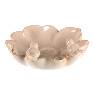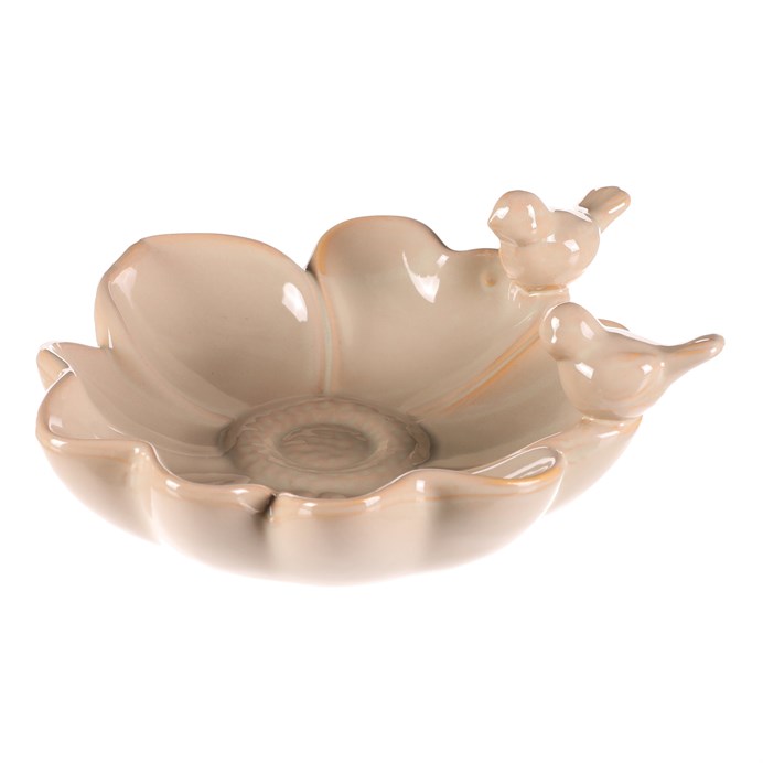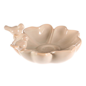 Dotaz na produktKrémově zbarvené keramické pítko pro ptáčky ve tvaru květu je nádhernou dekorací, která přitahuje pozornost nejen ptáčků, ale i všech kolemjdoucích a návštěvníků. Dva pěvci sedící na okraji pítka dodávají celému pítku hravý a veselý vzhled. Příjemně oživí vaši zahradu a stane se oblíbeným místem pro vaše opeřené návštěvníky, kteří se k vám tak budou rádi vracet.