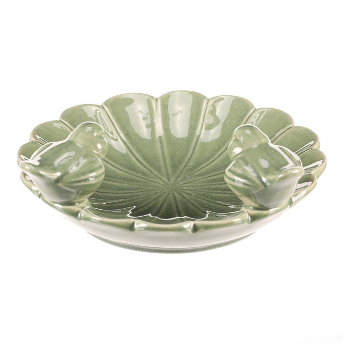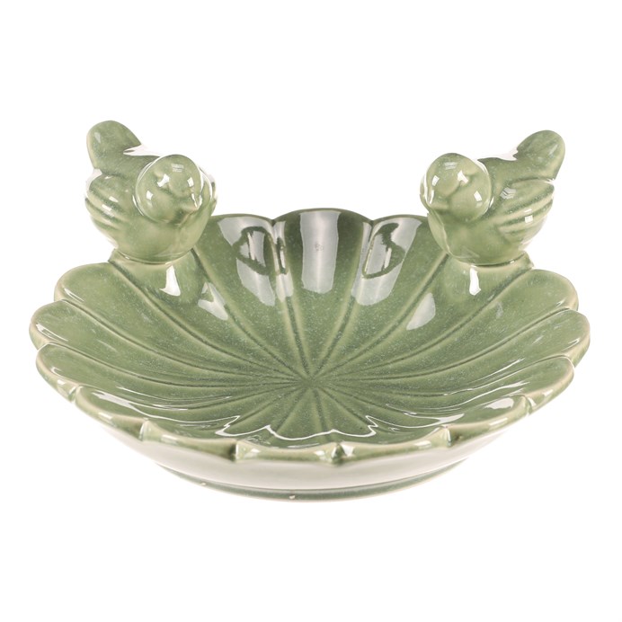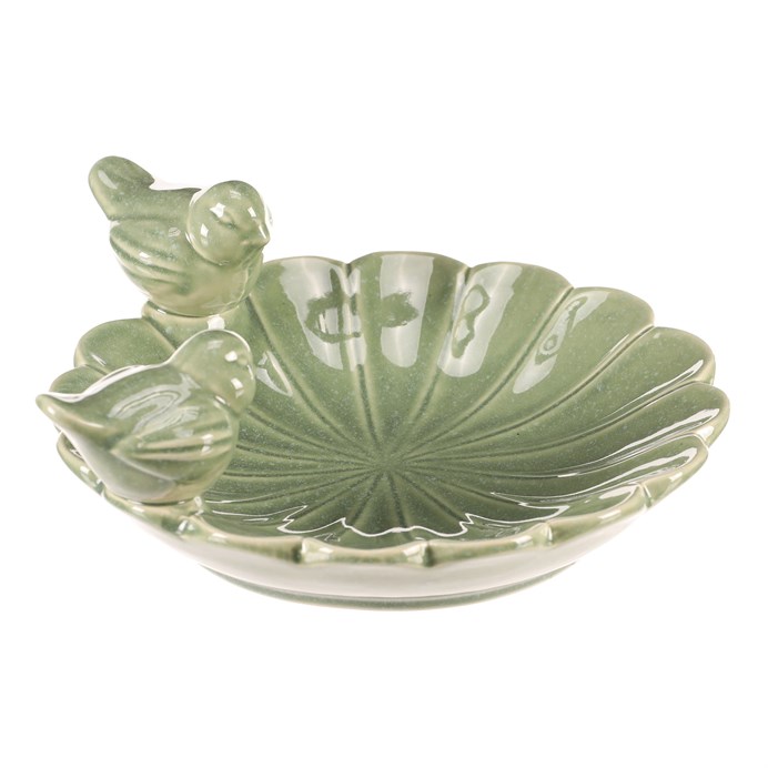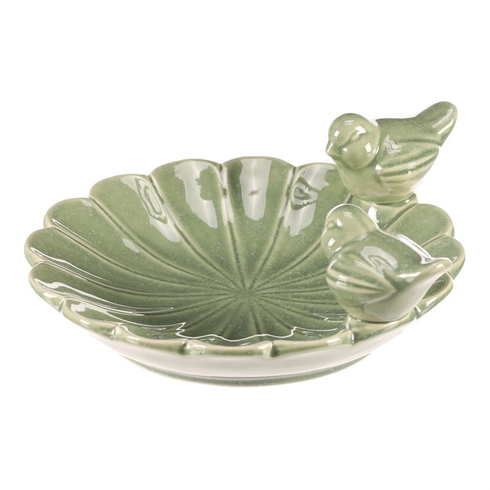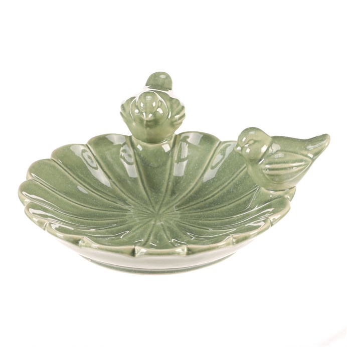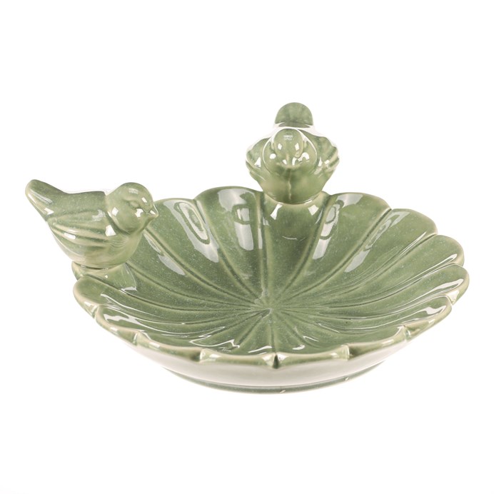 Dotaz na produktZelené keramické pítko pro ptáčky ve tvaru pravidelného květu je nádhernou dekorací, která přitahuje pozornost nejen ptáčků, ale i všech kolemjdoucích a návštěvníků. Dva pěvci sedící na okraji pítka dodávají celému pítku hravý a veselý vzhled. Příjemně oživí vaši zahradu a stane se oblíbeným místem pro vaše opeřené návštěvníky, kteří se k vám tak budou rádi vracet.