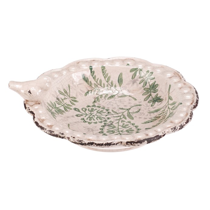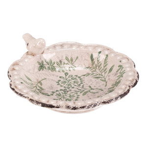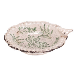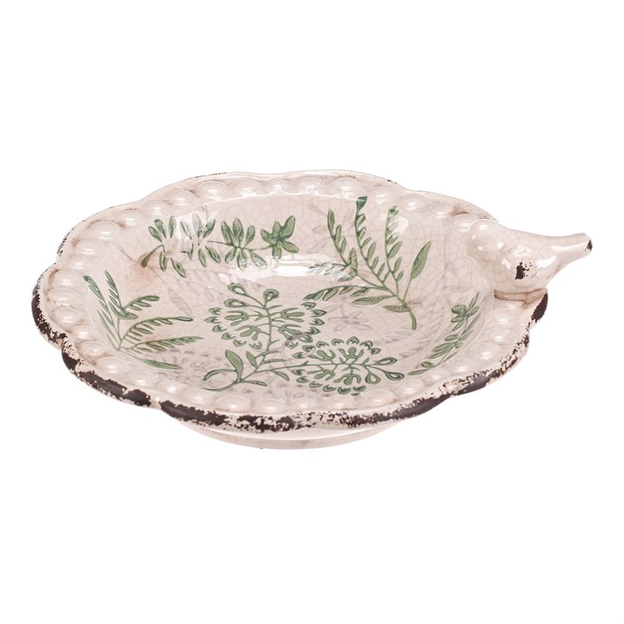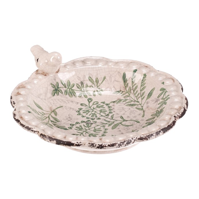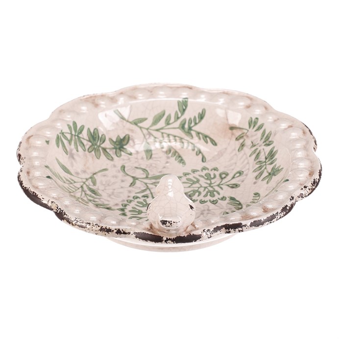Dotaz na produktKeramické krmítko a pítko ve tvaru retro talíře v krémovém odstínu zdobí jemný dekor zelených listů a drobná figurka ptáčka na okraji. Povrch s jemnou prasklinovou glazurou dodává výrobku rustikální vzhled, který se hodí do zahrad i na balkony. Díky pevné keramice je snadné na údržbu a stabilní při umístění venku. Velikost M nabízí dostatečný prostor pro krmení i napájení drobných ptáků. Vynikne jako praktický a zároveň dekorativní doplněk pro podporu ptactva v přírodě.