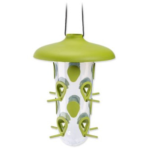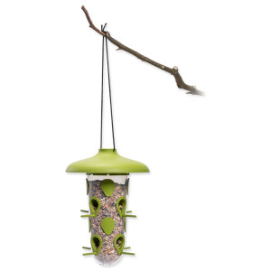 - Zároveň má spoustu otvorů, aby pohostilo co nejvíce malých okřídlených pěvců. Otvory můžete též překrýt krytkami, aby tolik směs nechtěně nevypadávala ven.