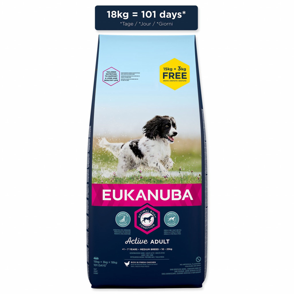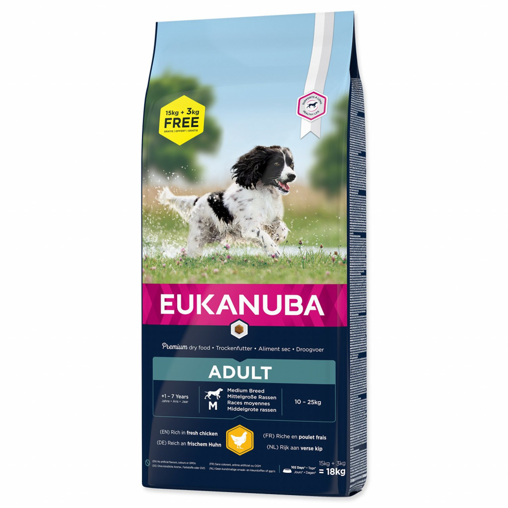 Receptura se zaměřením na konkrétní fázi života - pro středně velké aktivní dospělé psy od 1 roku do 7 let – poskytuje na míru upravenou výživu pro podporu štíhlých svalů a vyvážený příjem energie, které zajistí optimální tělesný stav vašeho dospělého psa. Naše jedinečná na míru upravená receptura pro středně velké dospělé psy obsahuje směs vlákniny, prebiotika FOS a řepné dužiny pro podporu zdravého zažívání, juku, která pomáhá snížit zápach ze stolice, přirozený zdroj mastných kyselin omega-6 a omega-3 pro zdravou kůži a srst, L-karnitin, který pomáhá s udržením váhy a antioxidanty vitamin E a C pro podporu imunitního systému. Naše unikátní granule ve tvaru šestiúhelníku s přídavkem DentaDefense také pomáhají s udržováním čistých a zdravých zubů. Pokročilá výživa pro středně velké dospělé psy se zaměřením na podporu optimálního tělesného stavu a celoživotní pohodu.
