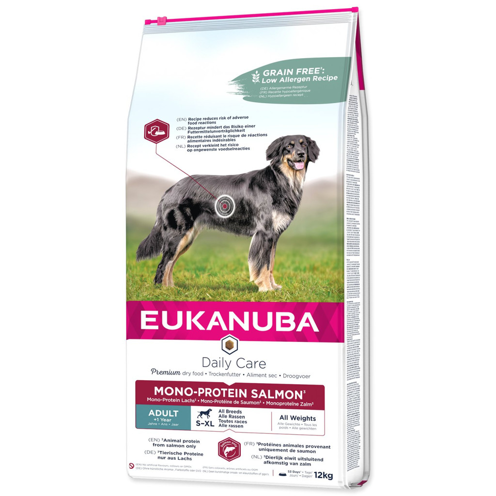 Dotaz na produkt Na splátky ještě dnesSuché krmivo EUKANUBA Daily Care pro dospělé psy – monoprotein, losos je receptura s jediným zdrojem živočišných bílkovin. Všechny živočišné složky v této jednodruhové stravě jsou pouze z lososa, aby se snížilo riziko nežádoucích reakcí na krmivo a podpořily se štíhlé svaly.