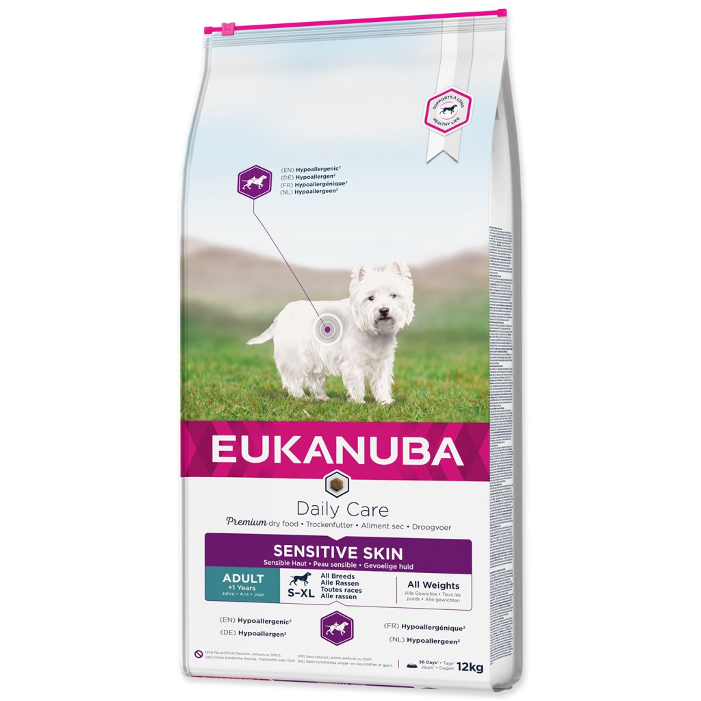 Krmivo obsahuje nezbytné vitamíny a minerály, které váš pes potřebuje. Lesklá srst a zdravá pokožka nejenže skvěle vypadají a jsou velmi příjemné na dotek – jsou také nejzřetelnějším znamením vnitřního zdraví psa. Někteří psi jsou však náchylní k citlivé pokožce. Mohou mít suchou a odlupující se pokožku, matnou srst a občasné svědění. Společnost Eukanuba si uvědomuje význam, jaký hraje výživa pro zdraví pokožky a srsti, a tak vytvořila krmivo Eukanuba Sensitive Skin, aby váš pes vypadal a cítil se skvěle. Pokud byste měli problém s pletí a změna jídelníčku by pomohla jej zvládnout, vrátili byste se ke své původní stravě? S největší pravděpodobností ne.