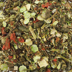 Složení: sušená vegetace rostoucí na trvalých pastvinách podhůří Alp, hrachové vločky 11,4 %, zelenina (sušená mrkev, sušená petržel 2,1 %, sušený pastinák, sušená červená řepa), byliny (sušené květy měsíčku lékařského 2 %, sušené kopřivy, sušená máta peprná 1,1 %, sušená meduňka, sušené pampelišky, sušený heřmánek), sušená jablka 4 %, vločky z bobu obecného 3,3 %, sušená vojtěška, lněná semena, semena černého kmínu, semena fenyklu.