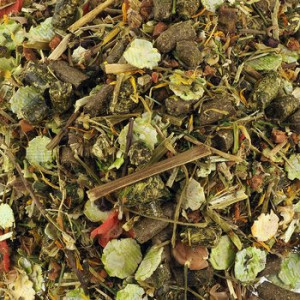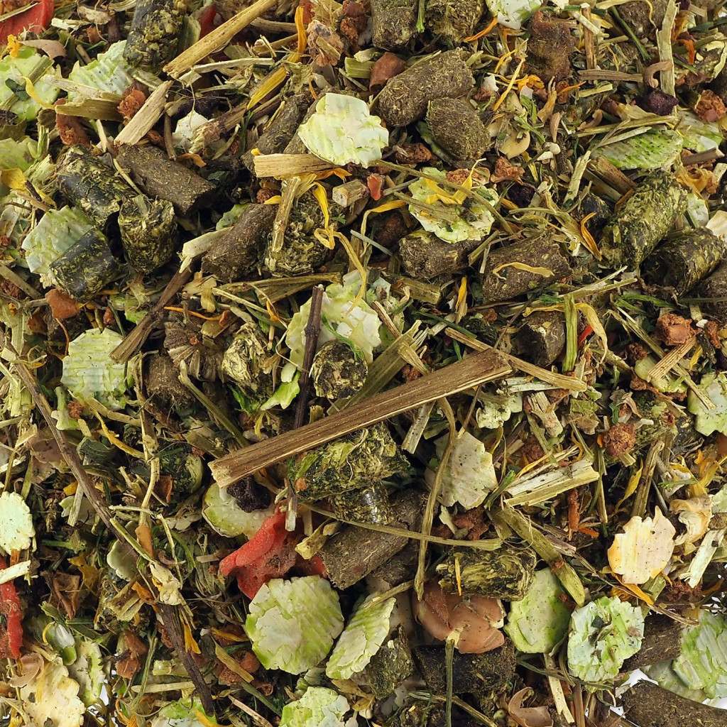 Složení: sušená vegetace rostoucí na trvalých pastvinách podhůří Alp, hrachové vločky 11,4 %, zelenina (sušená mrkev, sušená petržel 2,1 %, sušený pastinák, sušená červená řepa), byliny (sušené květy měsíčku lékařského 2 %, sušené kopřivy, sušená máta peprná 1,1 %, sušená meduňka, sušené pampelišky, sušený heřmánek), sušená jablka 4 %, vločky z bobu obecného 3,3 %, sušená vojtěška, lněná semena, semena černého kmínu, semena fenyklu.
