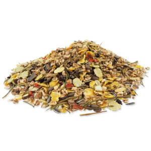 Složení: pšeničné vločky, oves 11 %, pšenice 10 %, kukuřičné vločky, kukuřice 8 %, ovesné vločky, hrachové vločky 6 %, proso la plata, zelenina (sušená petržel, sušená mrkev, červená řepa), pšeničné pukance, karob 3 %, semena travin, maso (sušené hovězí, sušené kuřecí 0,9 %, sušené ryby), extrudovaná kukuřičná mouka, lněné semeno, slunečnicová semena, špalda, sušené datle, rýže, sušení mouční červi 0,5 %.