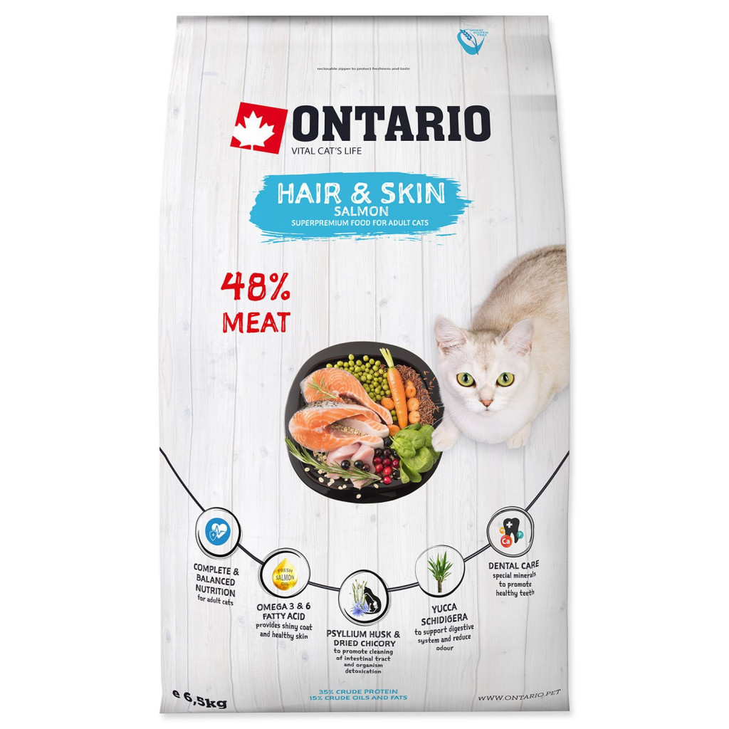 Vysoce kvalitní, superprémiové krmivo pro dospělé kočky s nízkým obsahem obilovin. Speciálně vyvinutá receptura určená pro podporu kůže a srsti. Má bohatě a nutričně vyvážené složení, které je základním pilířem pro zdravý a dlouhý život. Na prvním místě jsou kvalitní zdroje proteinu z lososa a kuřecího masa, pro zajištění ještě vyšší chutnosti a kvality je přidáváno čerstvé maso z lososa, které je bohaté na omega 3&6 mastné kyseliny. Ty napomáhají zdravé kůži a lesklé srsti. Pečlivě vybrané sušené ovoce a zelenina dodávají organismu potřebné vitaminy, s kombinací bylinek a koření, pomáhají chránit buňky díky jejích silným antioxidačním účinkům a tím organismus před nemocemi. Speciálně přidávaný indický jitrocel a sušená čekanka mají za úkol pročistit zažívací trakt, zbavit jej špatných látek a přirozeně působí na organismus detoxikačně. Společně s přidanou jukou podporují lepší zažívání a redukci nepříjemného zápachu. O ústní hygienu se starají speciálně přidávané minerály.