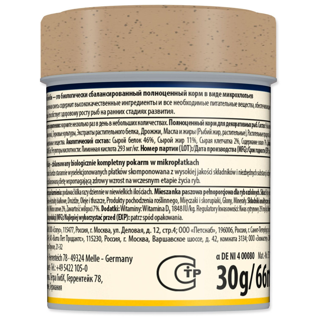 Dotaz na produktPráškové kompletní krmivo pro potěr (v délce do 1cm), obohacené doplňkovými živinami.