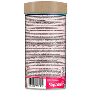 Složení: ryby a vedlejší výrobky z ryb, obiloviny, sušené krmné kvasnice, vedlejší výrobky rostlinného původu, měkkýši a korýši, oleje a tuky, řasy, maso a produkty živočišného původu, cukr, lecitin.