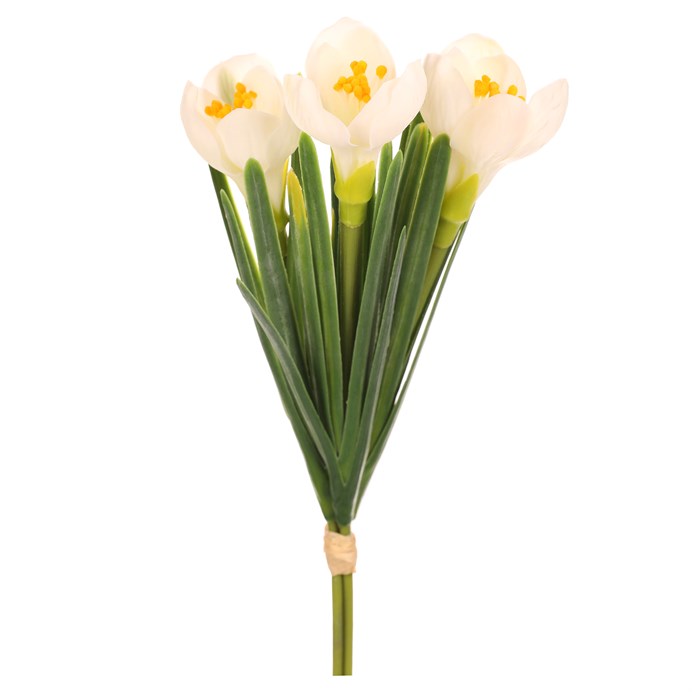 Dotaz na produktUmělá kytice krokusů v bílé barvě přináší do interiéru svěží jarní atmosféru bez nutnosti péče. Květiny jsou vyrobeny z kvalitního materiálu, který věrně napodobuje přirozenou strukturu okvětních lístků i listů. Svazek je pevně svázán a jednotlivé stonky jsou dostatečně ohebné pro snadné aranžování. Kytice je vhodná pro dekoraci stolů, okenních parapetů nebo jako součást větších aranžmá.
