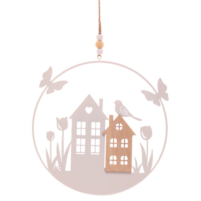Dotaz na produkt Na splátky ještě dnesTento závěsný kruh je kouzelnou dekorací, která v sobě spojuje domečky, ptáčky, květiny a motýly v jemných odstínech světlé béžové a přírodní barvy dřeva. Kombinace kovu a dřeva vytváří elegantní a příjemnou atmosféru, která potěší každého milovníka přírody. Závěsný kruh je skvělým způsobem, jak oživit váš domov, ať už ho umístíte do obývacího pokoje, na terasu nebo do zahrady. Přineste si kousek jara a radosti do svého interiéru a nechte tuto dekoraci, aby se stala středobodem pozornosti.