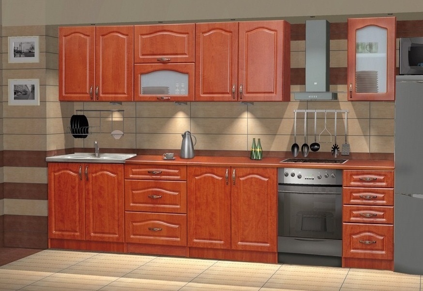 Moderní kuchyně, která patří mezi nejlevnější na trhu. Tato kuchyně je navržena tak, že skříňky se dají poskládat v libovolném pořadí, popřípadě další doobjednat, což vám umožní si sestavit kuchyni podle svých představ. Dvířka (MDF) i korpus (LTD) jsou také v barvě hruška. Sestava se skládá ze spodních skříněk - výška 82, hloubka 44, šířka: - 80 cm skříňka pod dřez - 80 cm skříňka dvoudveřová - 40 cm skříňka se 4 zásuvkami - 60 cm skříňka se 3 zásuvkami a vrchních skříněk - výška 72, hloubka 30: - 40 cm vitrína jednodveřová - 60 cm vitrína dvou-vyklop ( plná+sklo ) - 2x 80 cm skříňka dvoudveřová Rozložení skříněk naleznete na perokresbě pod ním. Sklo ve vitrínách je mléčné. Pracovní deska není v ceně, možnost dokoupení. Spotřebiče, dřez a digestoř v ceně nejsou. Nabízíme i sestavení si kuchyně na míru podle vašich kritérií nebo možnost doobjednání dřezu. Dodáváme v demontovaném stavu.