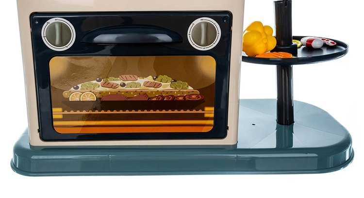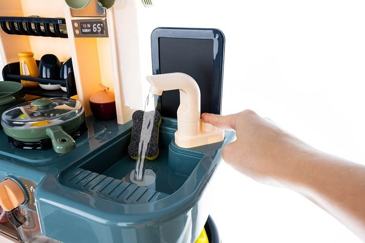 ? VODNÍ KOHOUTEK - do kuchyně jsme nainstalovali vodovodní baterii s čerpadlem. Stačí nalít vodu do dřezu, stisknout čerpadlo a voda vyteče z kohoutku! Je to uzavřený okruh. Dítě může oplachovat ovoce, zeleninu a mýt nádobí ! Všechny funkce vzbuzují zájem dětí a povzbuzují vás k zábavě .