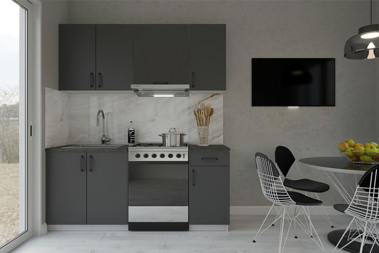 Materiál LTD, korpus je v šedé barvě, dvířka jsou v barvě grafit, úchyty jsou v černé barvě.