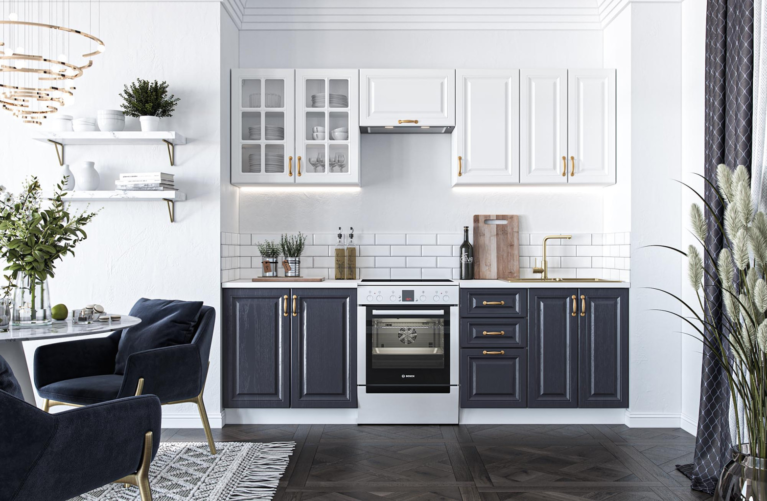 Dotaz na produkt Na splátky ještě dnesDélka soupravy 240 cm; plynové zvedáky, horní deska tloušťka 28 mm, čela MDF, barvy: přední část - bílá / tmavě modrá, korpus - bílá, horní část: bílá