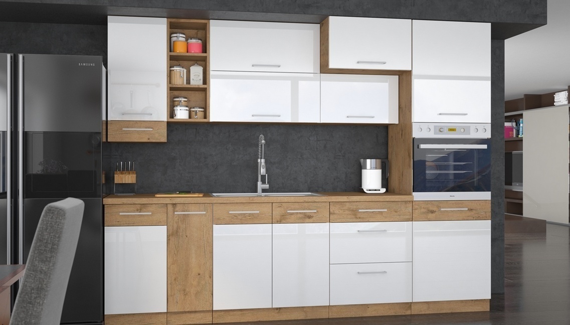 Vrchní kuchyňská skříňka s výklopnými dvířky 60GU-72-2F je vyrobena z lamina v dekoru dub lancelot v kombinaci s vysokým leskem. Prohlédněte si širokou nabídku skříněk a vytvořte si kuchyň dle vlastních představ. Může být rohová, rovná, krátká i dlouhá. Fantazii se meze nekladou. V doplňkových fotografiích najdete pro inspiraci fotky kuchyní, které jsou z těchto skříněk sestaveny. Skříňka je dodávaná v demontu. Součástí je montážní plánek včetně všech potřebných spojovacích materiálů.