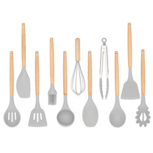 Náčiní je vyrobeno z kombinace silikonu a bambusu, která zajišťuje odolnost, dlouhou životnost a šetrnost k nádobí. Silikonové části nepoškrábou povrch hrnců a pánví, zatímco bambusové rukojeti poskytují pevný a pohodlný úchop. Součástí je také praktický stojánek pro přehledné uložení.