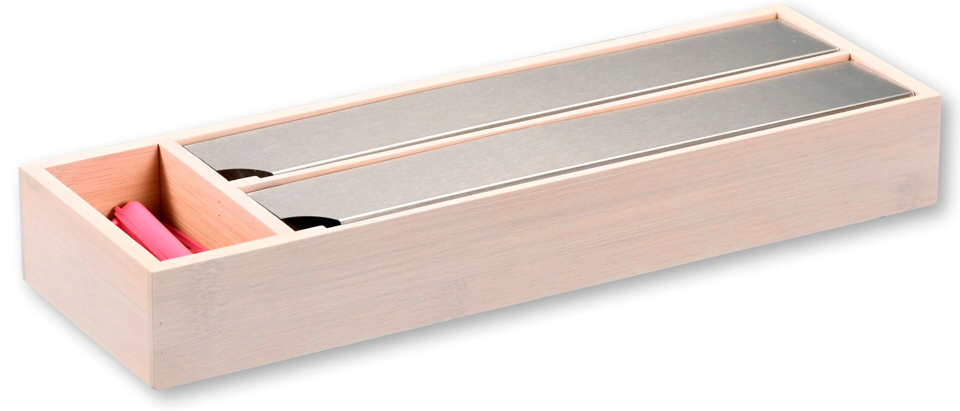 Elegantní kuchyňský zásobník na fólie vyrobený z bambusu s certifikátem FSC® poskytuje tři praktické přihrádky. Dvě z nich jsou opatřeny nerezovými víky s odtrhávacími okraji pro snadné použití fólií. Zásobník je ideálním pomocníkem v každé kuchyni.