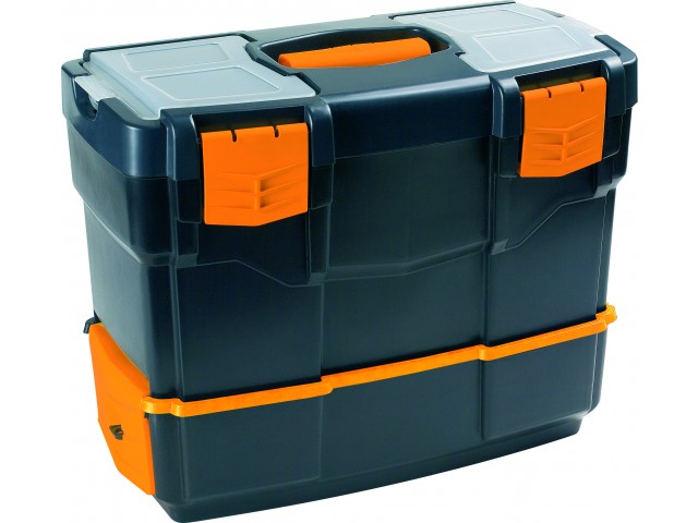 Kufr s přídavným boxem na nářadí. Boxy spojeny zaklapávacím mechanismem, možno používat odděleně. Vyrobeny z odolného plastu - polypropylenu, tedy odolné vůči olejům. Jedna vyjímatelná police, zásobníky na drobný materiál na vnější straně víka.