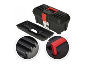Kufr na nářadí svnitřním zásobníkem z odolného plastu. Kufr se snadno přenáší, protože obsahuje plastovou rukojeť. Je uzavíratelný pomocí klipu. . Rozměry kufru jsou 40 x 20 x 18,5 centimetrů.