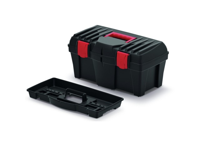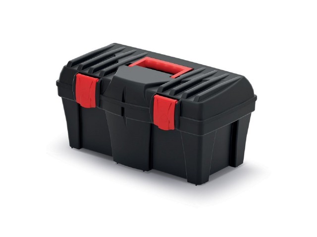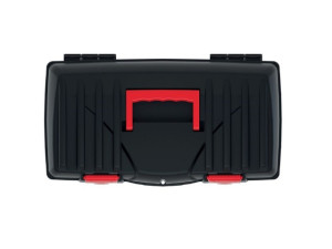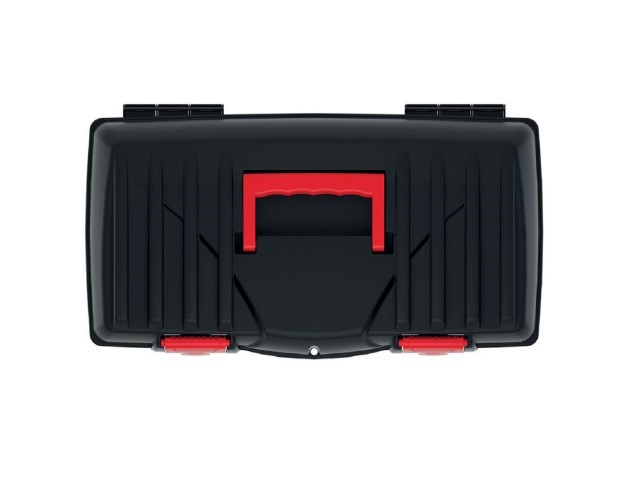 Skvělí kufr na nářadí, který je vyrobený z**odolného plastu. ** Má černé víko a disponuje červenou**plastovou rukojetí ** pro snadný přenos. Rozměry kufru jsou 46 x 25,7 x 22,7 centimetrů.