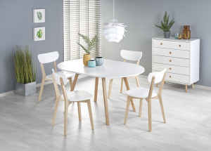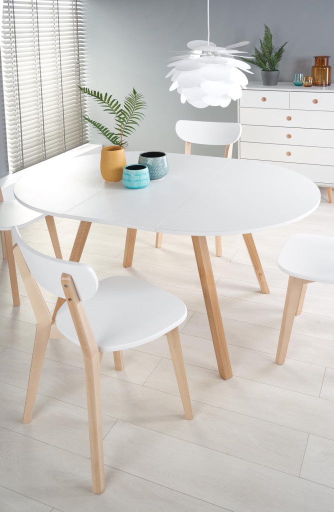 Dřevěný jídelní stůl je vyroben v kombinaci MDF a masiv. Stůl se dodává v barevném provedení matná bílá. Ke stolu doporučujeme dokoupit jídelní židli Buggi.