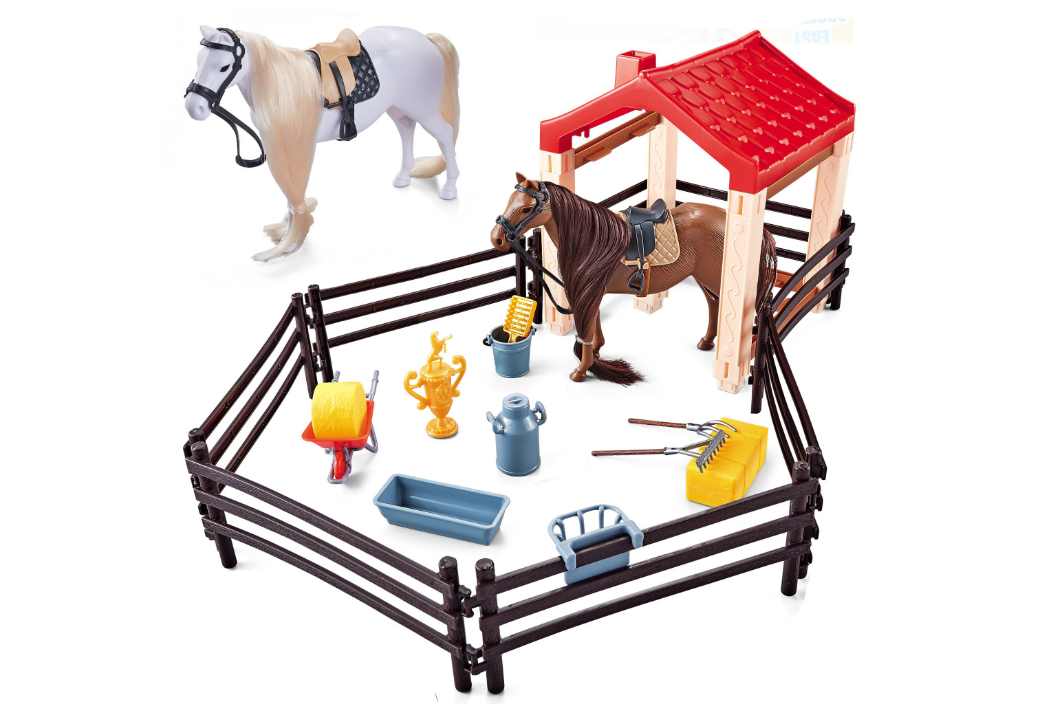Dotaz na produktKůň 2 ks s ohradou. Velikost koně 14cm. Obsahuje 2 koně, ohradu a přístřešek pro koně, příslušenství k péči o koně. Návod ke složení ohrady a přístřešku na obale.