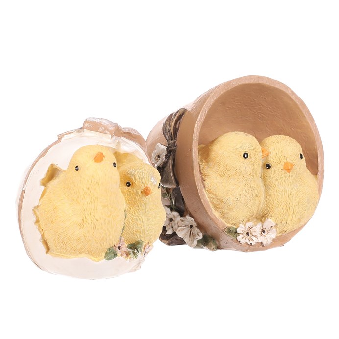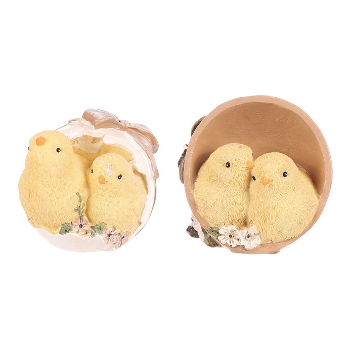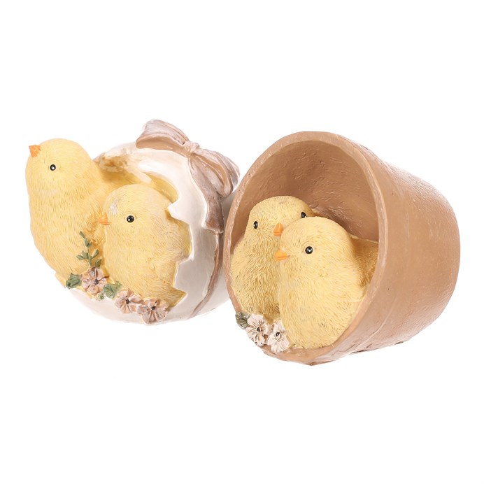Dotaz na produkt Na splátky ještě dnesTyto roztomilé dekorace z polyresinu představují právě vylíhnutá žlutá kuřátka, která vnesou do vašeho domova jarní a velikonoční atmosféru. Vyberte si mezi kuřátkem v květináči nebo ve vajíčku a užijte si to pravé kouzlo jara.