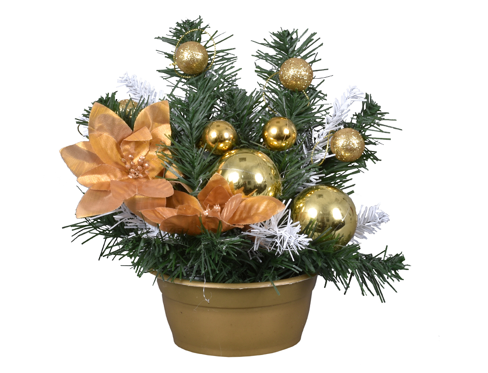 Dotaz na produktVazba z umělých květin. Aranžmá z umělých květin imitujících vánoční hvězdy je umístěna v nízké nádobě. Vazba je dozdobena jehličinou a vánočními ozdobami. Vhodná sezóna: vánoce. Velikost: 25 cm. Barva: zlatá.