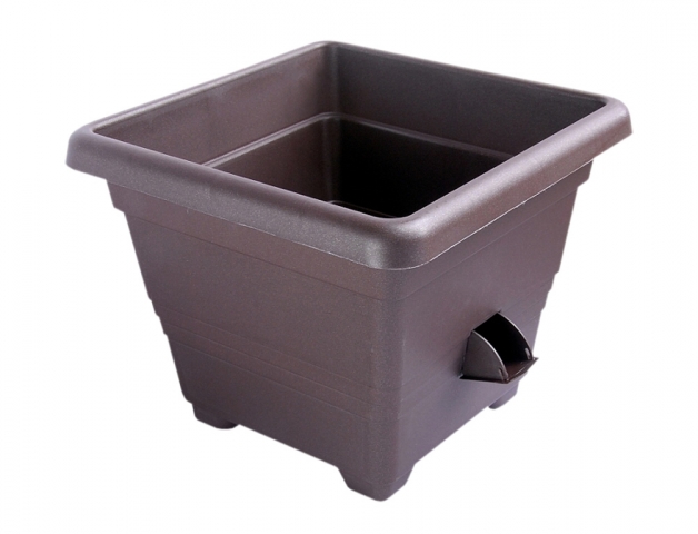 Květník čtvercového půdorysu s hladkým povrchem a nožičkami umožňujícími odtok vody. Kromě knotu obsahuje okénko na zalévání, k odtoku přebytečné vody při dešti a přístupu vzduchu ke kořenům. Rozměry: 40 x 40 cm, výška: 32 cm.