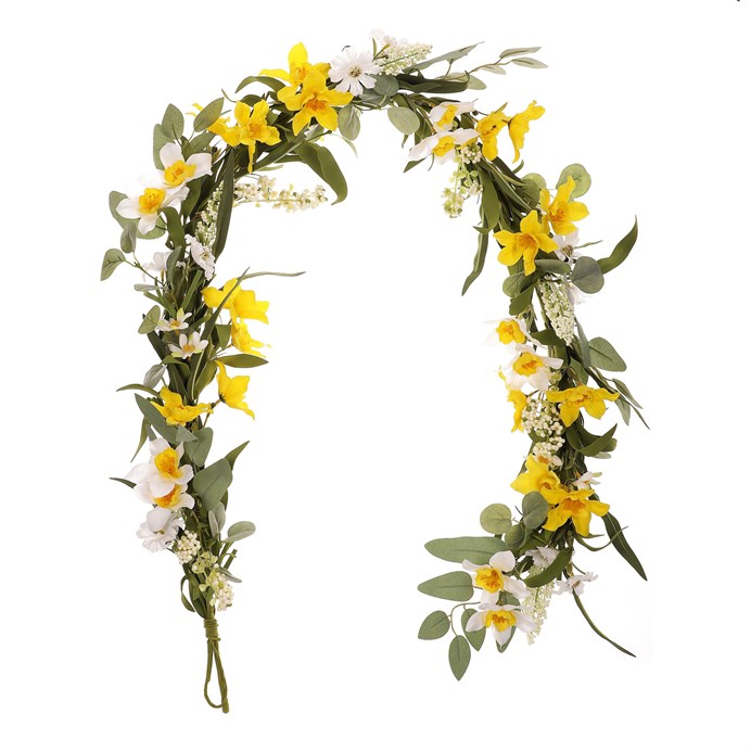 Dotaz na produkt Na splátky ještě dnesTato 150 cm dlouhá girlanda s proutěným základem je zdobena žluto-zelenými umělými květinami a zelení. Ideální jako trvalá jarní dekorace, která přinese svěžest a živé barvy do vašeho domova, ať už ji zavěsíte na dveře, zábradlí nebo jiná místa.