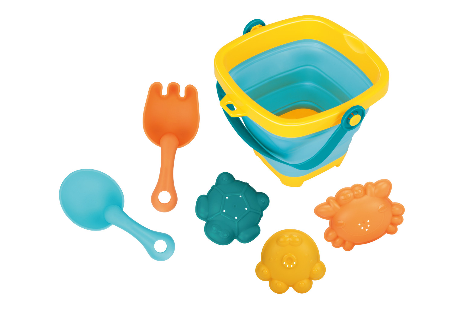 Dotaz na produktKyblík skládací do vany nebo na písek. Obsah balení - skládací kyblík 19x18 cm, 3 formičky - želva, krab, žába, hrabičky a lopatka.