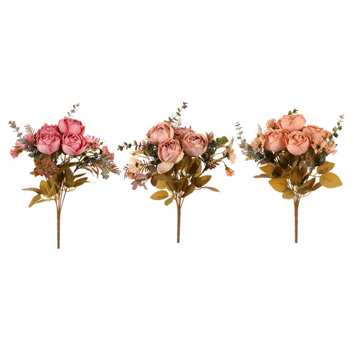 Dotaz na produkt Na splátky ještě dnesKytice z umělých růží v tlumených odstínech růžové, oranžové a červené, přináší do vašeho prostředí podzimní atmosféru s téměř nerozeznatelnými květinami od skutečných. Tyto trvanlivé květinové dekorace zůstávají stále jako čerstvé, aniž by uvadly nebo hrozilo opadání okvětních lístků. Nechte kytici vyniknout samostatně v krásné váze, jenž bude zdobit stoly, poličky, okenní parapety a další dobře viditelná místa. S jejím realistickým vzhledem a trvanlivostí představuje skvělý doplněk pro každý interiér i venkovní prostory, bez nutnosti péče a údržby.