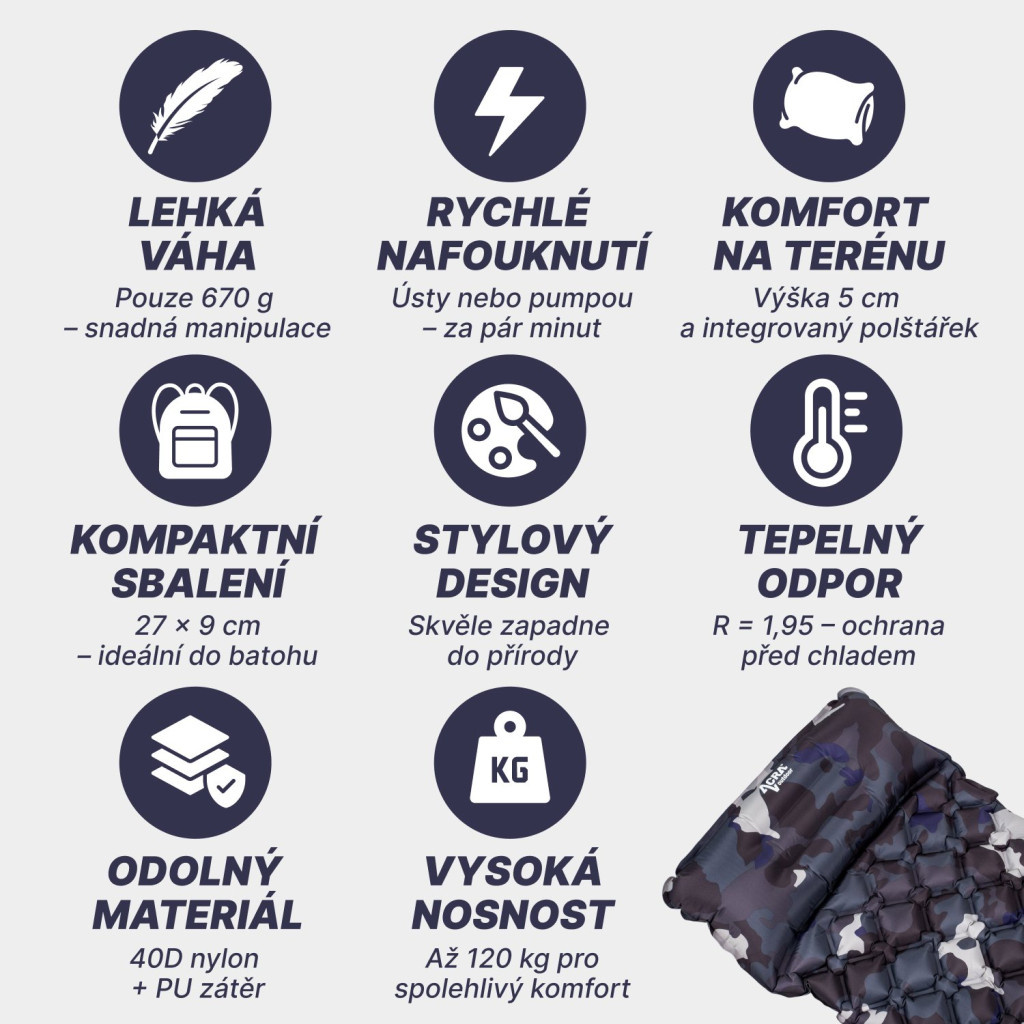 Dotaz na produktACRA L140M Nafukovací karimatka šedobéžově maskáčová: Lehký a kompaktní společník pro náročné turisty!
