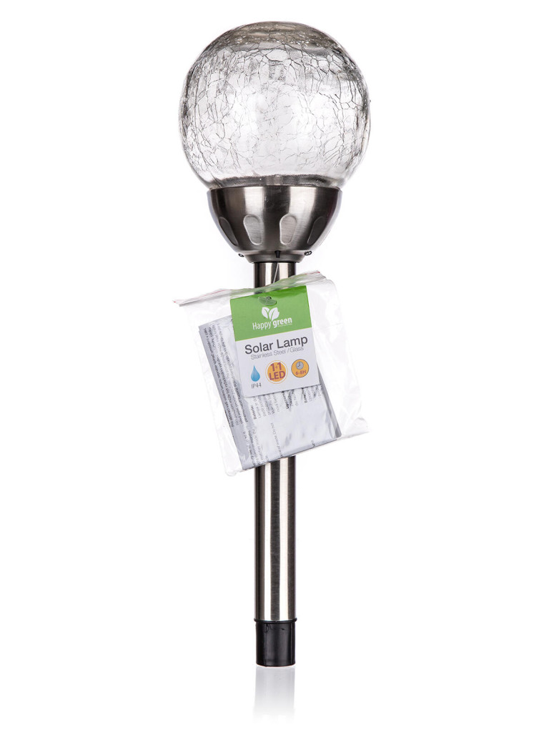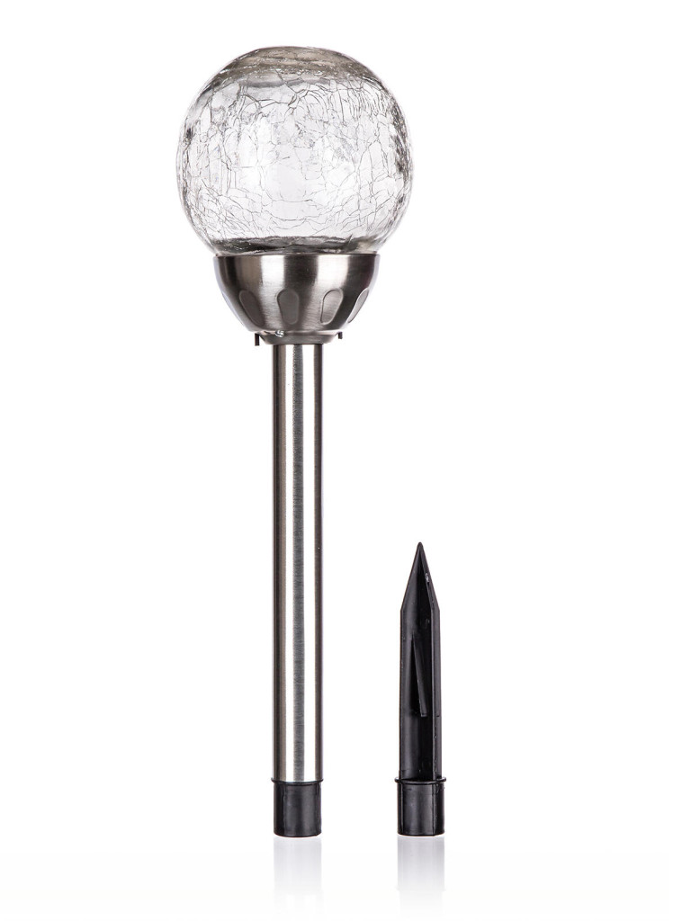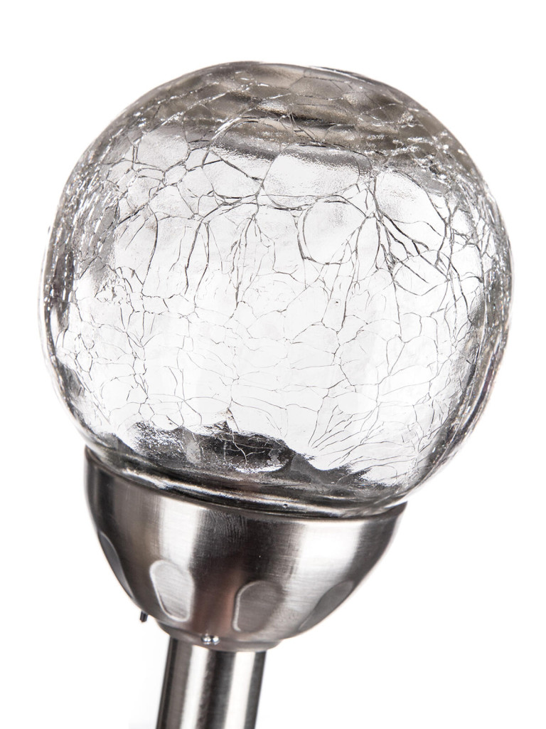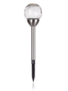 Solární nerezová lampa o výšce 38,5 cm, se skleněným dekoračním stínidlem ve tvaru koule s pavučinovým dekorem o průměru 10 cm, je funkční a zároveň ozdobná součást do každé zahrádky.
