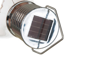 Závěsná solární lampa se stínidlem ve tvaru žárovky.