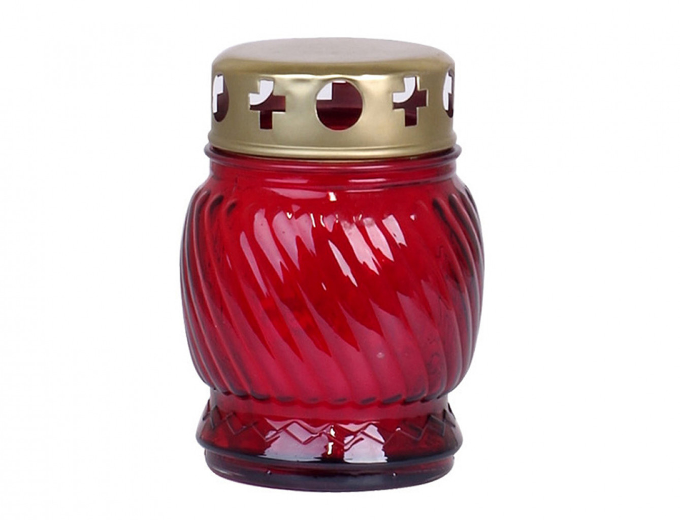 Dotaz na produktHřbitovní lampa se zdobením, soudkovitého tvaru. Je vyrobena ze skla, podstavec a víčko jsou kovové. Vosk je nalitý přímo v lampě. Hmotnost náplně: 25 g. Doba hoření: 7 hodin. Rozměry: výška 10 cm. Barva: červená, zlatá.